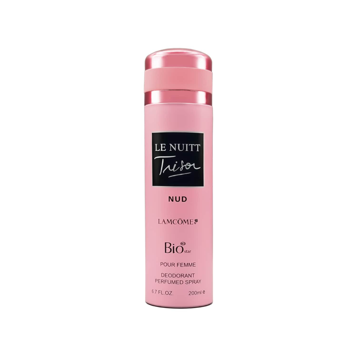 اسپری بدن زنانه بیو استار مدل لانکوم لانویت با الهام از عطر محبوب و جذاب Lancôme La Nuit Trésor، رایحهای شرقی، گلی و گرم دارد که حس رمزآلودگی، احساس عمیق و زنانهگی را به بهترین شکل منتقل میکند. این اسپری انتخابی عالی برای شبها و مناسبتهای خاص است.