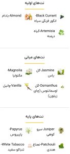- نت پایه: نعناع هندی (پاتچولی)، چوب عرعر، پاپیروس، تنباکوی سفید