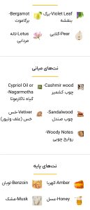 - نت آغازین: نیلوفر آبی، گلابی، ترنج، برگ گل بنفشه