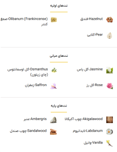 در نت ابتدایی، رایحه گلابی تازه و نتهای شیرین فندق حس میوهای و ملایم را ارائه میدهد. قلب عطر با نتهای گل یاس، رز و زعفران پیچیدگی و جذابیت خاصی به رایحه میبخشد. در نتهای پایانی، ترکیب چوب صندل، وانیل و کهربا ماندگاری و عمق بیشتری ایجاد میکند.