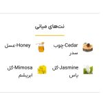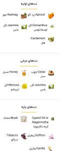 - نت میانی: گل یاس، عسل، چوب سدر، درخت گل ابریشم (Silk tree)