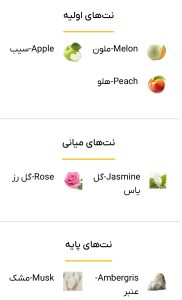 - نت میانی: گل رز، یاس، شکوفههای سفید، گل سفید (حس گلی و لطیف)