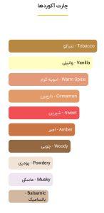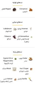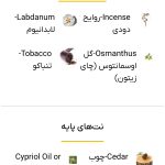- نتهای میانی: تنباکو، لادن، بخور، گل اوسمانتوس