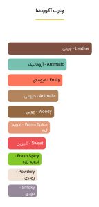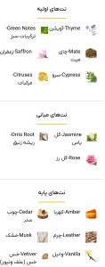 - نتهای پایه: چرم، خسخس، سدر، مشک، کهربا، وانیل