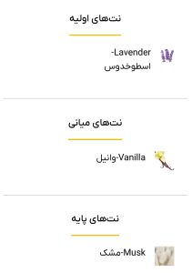 نت آغازین: اسطوخودوس، پرتقال ماندارین، ترنج، جوز هندی، چای، شکوفه پرتقال