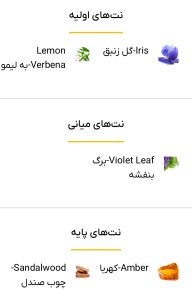 - نت میانی (Heart Notes): برگ بنفشه، ایریس، حس پودری و فریزیایی